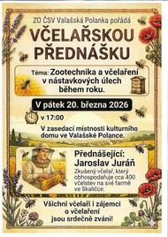 ZO ČSV Valašská Polanka pořádá v pátek 20. března 2026 v 17:00 h v zasedací místnosti Kulturního domu ve Valašské Polance včelařskou přednášku na téma Zootechnika a včelaření v nástavkových úlech během roku. Přednášet bude pan Jaroslav Juráň - zkušený včelař, který obhospodařuje cca 400 včelstev na své farmě ve Skaličce. Všichni jste srdečně zváni.
