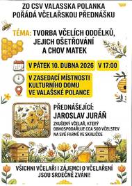 ZO ČSV Valašská Polanka pořádá v pátek 10. dubna 2026 v 17:00 h v zasedací místnosti Kulturního domu ve Valašské Polance včelařskou přednášku na téma Tvorba včelích oddělků, jejich ošetřování a chov matek. Přednášet bude pan Jaroslav Juráň - zkušený včelař, který obhospodařuje cca 400 včelstev na své farmě ve Skaličce. Všichni jste srdečně zváni.