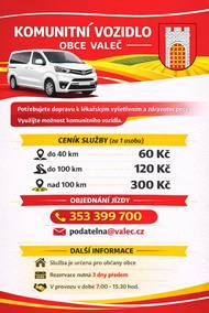 Komunitní vozidlo obce Valeč slouží k dopravě občanů k lékařským vyšetřením a za zdravotní péčí. Služba je určena pro občany obce, rezervace je nutná alespoň 3 dny předem. V provozu je v době 7:00 - 15:30 hodin. Objednání na tel. 353 399 700 nebo nebo emailem podatelna@valec.cz.