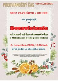 Obec Vavrišovo a OZ HKR pozývajú na rozsvietenie vianočného stromčeka, ktoré sa uskutoční 6. decembra 2025 o 16:15 pred budovou obecného úradu. Príďte si užiť atmosféru s Mikulášom a jeho pomocníkmi.