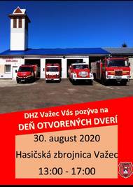 Dňa 30.8.2020 sa v hasičskej zbrojnici vo Važci uskutoční deň otvorených dverí. V čase od 13:00 do 17:00 Vás hasiči radi privítajú vo svojich priestoroch. Prezrieť si budete môcť hasičskú techniku, priestory zbrojnice, vyskúšať zásahovú výstroj alebo sa povoziť na hasičskom aute.
