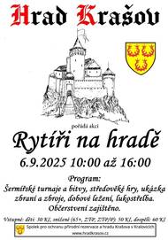 Dovolujeme si Vám tímto sdělit, že v sobotu 6.9.2025 od 10:00-16:00hod pořádá Spolek pro ochranu přírodní rezervace a hradu Krašova akci Rytíři na hradě Krašov Program: Šermířské turnaje a bitvy, středověké hry, ukázka zbraní a zbroje, dobové ležení, lukostřelba a komentované prohlídky hradu.