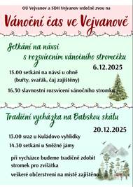 OÚ Vejvanov a SDH Vejvanov srdečně zvou na setkání na návsi s rozsvícením vánočního stromečku 6.12.2025 a na tradiční vycházku na Babskou skálu 20.12.2025.