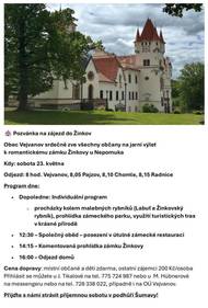 Obec Vejvanov srdečně zve všechny občany na jarní výlet k romantickému zámku Žinkovy u Nepomuka v sobotu 23.5.2026.