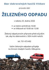 Sbor dobrovolných hasičů Vítězov pořádá sběr železného odpadu v sobotu 25. dubna 2026. Akce se uskuteční ve dvou lokalitách: ve Velimi od 8:00 do 10:00 a ve Vítězově od 10:00 do 12:00. Železný odpad, prosím, připravte před svůj dům, aby ho dobrovolníci z SDH mohli naložit. Děkujeme za vaši podporu.