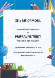 ZŠ a MŠ Drmoul přijímá do 31. května 2026 žádosti o zařazení dětí do přípravné třídy pro školní rok 2026/2027.