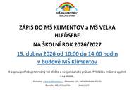 Dne 15. dubna 2026 od 10:00 do 14:00 hodin v budově MŠ Klimentov.