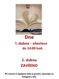 1. dubna 2026 - otevřeno do 14 hodin. 2. dubna 2026 - zavřeno.