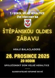 TJ SOKOL Velké Heraltice zve všechny na ,,ŠTĚPÁNSKOU", hrát bude BALACLADERS a vstupné bude slosovatelné.
