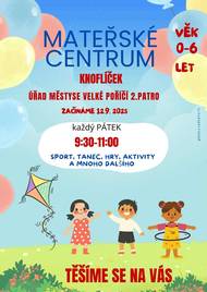 V pátek 12. září se znovu otevírají brány mateřského centra Knoflíček ve Velkém Poříčí. Těšíme se na vás od 9:30 hod. ve druhém patře v budově Úřadu městyse. Čekají nás hry, tanec a mnoho společné zábavy. Přijďte mezi nás.