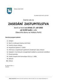 Vážení občané, zveme vás na zasedání zastupitelstva, které se koná ve středu 17. září 2025 od 16:00 hodin v sále Obecního domu ve Velkém Poříčí.