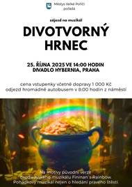Ahoj všichni milovníci kultury a krásných příběhů! 🌟 Zveme vás na zájezd do Prahy, který rozhodně stojí za to — 25. října 2025 se vydáme společně autobusem za nezapomenutelným zážitkem: muzikálem „Divotvorný hrnec“. 🎭 Co je Divotvorný hrnec? Jedná se o pohádkový muzikál, původně americký „Finian’s Rainbow“ (Broadway 1947), který v české adaptaci převedli Jiří Voskovec a Jan Werich. Příběh kombinuje kouzlo, humor, snění a naději. 🚍 Detaily zájezdu Kdy: 25. října 2025 Odjezd: Ráno v 8:00 z náměstí Pro koho: pro všechny, kdo chtějí zažít kulturu, pohádku, hudbu a výbornou atmosféru Vstupenky zakoupíte na podatelně Úřadu městyse. Neváhejte.