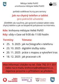 Digitální odysea pro pokročilé Navazující kurzy práce s chytrými telefony pro seniory, kteří už zvládají základy a chtějí se naučit něco navíc. Setkáváme se jednou měsíčně, vždy s novým praktickým tématem: 23. 10. 2025 Digitální služby státu Dozvíte se, jak využívat Portál občana, datovou schránku nebo eRecepty. Zjistíte, že vyřídit si úřední záležitosti online je pohodlné a šetří čas. 20. 11. 2025 Práce s mapou a vytvoření tras Naučíte se vyhledávat místa na mapě, zjistit si dopravní spojení nebo si naplánovat vlastní trasu pro výlet. 18. 12. 2025 Jak pracovat s AI Přiblížíme si umělou inteligenci a ukážeme si, jak vám může pomoci v běžném životě – od rychlého vyhledávání informací až po tvořivé nápady. Kde: knihovna městyse Velké Poříčí Kdy: od 9:00 do 11:00 hodin V případě vašeho zájmu vás prosíme o přihlášení předem kvůli omezené kapacitě míst.