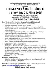 Občanské sdružení Diakonie Broumov ve spolupráci s Místní skupinou Českého červeného kříže Velké Poříčí pořádá v úterý 21. října humanitární sbírku. Darované věci můžete odevzdávat v Sokolovně od 9:00 do 11:00 hodin a od 13:00 do 17:00 hodin. Darujte prosím věci použité, ale stále ještě funkční.