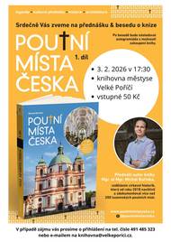 Zveme vás na přednášku a besedu o knize Poutní místa Česka s panem Michalem Bařinkou. Přednáška se koná v úterý 3. února od 17:30 v knihovně městyse Velké Poříčí. Vstupné je 50 Kč. V případě zájmu vás prosíme o včasné přihlášení telefonicky na 491 485 323, e-mailem na knihovna@velkeporici.cz nebo osobně v knihovně. Těšíme se na vás.