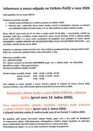 Informujeme občany, že od 17.3.2026 bude otevřena kompostárna ve Velkém Poříčí. Otevírací doba kompostárny: pondělí: zavřeno úterý: 14:00 - 17:00 středa: zavřeno čtvrtek: 14:00 - 17:00 pátek: zavřeno sobota: 08:00 - 12:00