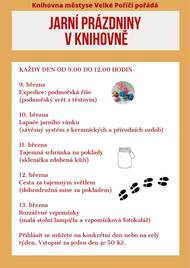 Máte už plány na jarní prázdniny? 🌸 Vezměte děti do knihovny, kde nuda rozhodně nehrozí! Každé dopoledne se u nás budeme tvořit, objevovat a vyrábět. Co nás čeká? 🍝 Podmořský svět z těstovin 🌬️ Lapače jarního vánku 💎 Tajemné schránky na poklady 🕵️♂️ Dobrodružná mise za světlem 📸 Výroba lampiček a fotokoláží 📅 Kdy: 9.–13. března, vždy od 9:00 do 12:00 📍 Kde: Knihovna městyse Velké Poříčí 💰 Vstupné: 50 Kč / den Můžete se přihlásit na jeden den, nebo s námi strávit klidně celý týden. Těšíme se na vás! odkaz na online přihlášku zde: https://forms.gle/iMrhC24dkdEVbqRN9