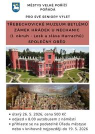 Městys Velké Poříčí pořádá v úterý 26. května 2026 poznávací výlet pro seniory. Program zahrnuje návštěvu Třebechovického muzea betlémů a prohlídku zámku Hrádek u Nechanic (okruh Lesk a sláva Harrachů). Součástí dne je také společný oběd. Odjezd: v 8.00 hodin autobusem z náměstí. Cena: 500 Kč. Zájemci se mohou hlásit na podatelně Úřadu městyse nebo v knihovně nejpozději do 19. 5. 2026. Těšíme se na společné zážitky!