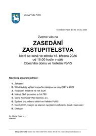 Zveme vás na ZASEDÁNÍ ZASTUPITELSTVA, které se koná ve středu 18. března 2026 od 16:00 hodin v sále Obecního domu ve Velkém Poříčí. Jednotlivé body programu viz. příloha.