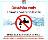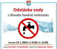 Odstávka vody s důvodu řešení havárie vodovodu Voda nepoteče ve středu 21. ledna od 8 do 14 hodin, týká se ulic Na Návsi, U Studánky, části ulic Kožovská a Hlavní