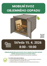 Ve středu 15.4.2026 proběhne mobilní svoz OBJEMNÉHO ODPADU. Odpad předávejte pracovníkovi obce v čase 8:00-18:00 pod budovou OÚ Velké Všelisy. ♻️ A jaký odpad sem patří? starý nábytek (skříně, postele, židle,…) matrace, koberce, linoleum sanitární keramika (umyvadla, WC mísy) dětské kočárky, autosedačky sportovní vybavení (lyže, kola,…) Nebezpečný odpad nebude v tento den vybírán! Termín svozu upřesníme později. Prostor je nepřetržitě monitorován kamerovým systémem.