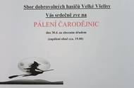 Sbor dobrovolných hasičů Velké Všelisy Vás zve na pálení čarodějnic. 30.4.2026 za obecním úřadem, zapálení ohně cca v 19:00 hod. Pokud by chtěli občané obce pomoci s výstavbou hranice a výrobou čarodějnice, tak se mohou zůčastnit v sobotu 25.4.2026 od 09:00 hod pod obecním úřadem.