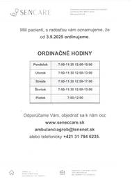 MUDr. Beáta Révayová oznamuje svojim pacientom, že od pondelka 29.9. do piatka 3.10.2025 bude ordinovať v ambulancií na Lichnerovej ulici 39/A v Senci. Ambulancia vo Veľkom Grobe bude v tomto týždni ZATVORENÁ.