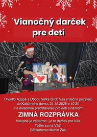 Náš spoluobčan a zároveň bábkoherec Mgr. Art. Martin Žák si pre deti tento rok pripravil krásny vianočný darček. Na Štedrý deň doobeda, kým Vy budete v kuchyni pracovať na príprave sviatočnej večere, pozýva všetky deti na čarovné divadelné predstavenie ZIMNÁ ROZPRÁVKA do Kultúrneho domu.