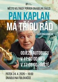 V pátek 24. dubna 2026 pořádá město divadelní zájezd do Divadla Na Fidlovačce. Odjezd autobusu je naplánovaný na 17:00 od parkoviště u MěÚ Veltrusy, následně zastaví autobus také u fotbalového hřiště. Začátek představení v 19:00, délka představení včetně přestávky cca 2,5 hod. Více o představení: https://www.veltrusy.cz/mesto/aktuality/divadelni-zajezd-pan-kaplan-ma-tridu-rad-plne-obsazeno