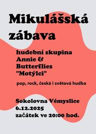 Srdečně vás zveme na Mikulášskou zábavu, která se koná 6. prosince 2025 od 20:00 hod. v sokolovně Vémyslice. K tanci a poslechu zahraje skupina Annie G Butterflies, která se zaměřuje na pop a rock, a představí skladby z českého i světového repertoáru.