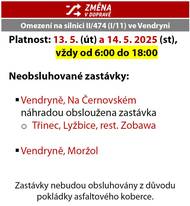 13. a 14. 5.2025 od 8:00 do 18:00 hod nebudou obsluhovány autobusové zastávky Vendryně Moržol a Vendryně Na Čornovském.
