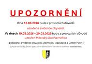 Dovolujeme si Vás informovat o dočasném omezení hodin pro veřejnost provozovny Verneřice, Českolipská 294, Verneřice, 40725. Provozovna bude omezena na nezbytně nutnou dobu dne 9.1.2026 z provozních důvodů. Upravená otevírací doba provozovny: Den v týdnu Standardní HpV Dočasné HpV Pátek 08:00 – 12:00, 13:00 – 15:00 hod 08:00 – 12:00 hod