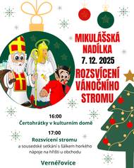 Přijďte se potkat s Mikulášem, čertem a andělem a účastnit se předvánočních soutěží a ochutnat skvělé občerstvení na sále našeho KD ve Vernéřovicích! Užijte si nezapomenutelnou atmosféru spojenou s mikulášskou nadílkou.