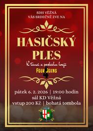 V pátek 6. 2. 2026 od 19:00 hodin se v sále Kulturního domu ve Věžné uskuteční tradiční hasičský ples, na který vás srdečně zve místní Sbor dobrovolných hasičů. K tanci a poslechu hrají Four Johns. Přijďte si užít skvělou zábavu. Podrobnosti najdete na přiloženém plakátě.