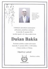 So zármutkom vám oznamujeme, že dňa 10. januára 2026 nás navždy opustil v 62 roku svojho života pán Dušan Bakša z Riečnej ulice. Posledná rozlúčka sa bude konať 15. januára 2026 o 13:00 hod. v Dome smútku vo Vidinej