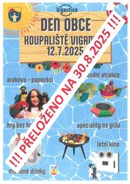 Přijďte si užít Den obce na koupališti ve Vígantici! Čeká na vás bohatý program včetně turnaje v beachvolejbale, vodních atrakcí, dílniček pro děti a vystoupení kapely.