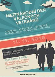 Město Vimperk si v úterý 11. listopadu 2025 společně se zástupci Armády České republiky, zástupci Československé obce legionářské – jednoty Vimperk a 35. pěšího pluku z Plzně připomene Mezinárodní den válečných veteránů a výročí ukončení první světové války. Hlavní pietní akt se uskuteční od 11:00 hodin pod zvonicí na náměstí, v průběhu celého dne pak postupně proběhnou vzpomínky i v osadách. Doprovodný program akce je pořádán ve spolupráci se ZUŠ Vimperk. Zveme všechny občany, aby se připojili k pietním aktům s květem vlčího máku na klopě k uctění památky všech, kteří bojovali a obětovali se za naši svobodu. Vlčí máky na podporu válečných veteránů lze zakoupit například ve sbírce Paměti národa. Ve Vimperku jsou prodejní místa v Kavárně Ve Skále v Pivovarské ulici a v prodejně Kytky od Pepy v Portin Parku na Śpidrově ulici. Harmonogram pietních aktů 08:00 – Klášterec 08:30 – Cejsice 11:00 – Vimperk 13:05 – Boubská, u kříže 13:15 – Boubská, náves 14:30 – Bořanovice 16:00 – Výškovice