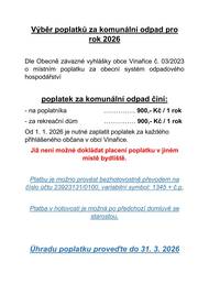 Vážení spoluobčané, v sobotu dne 18. 04. 2026 společnost AVE přistaví kontejner na svoz nebezpečného a velkoobjemového odpadu. Od 08:00 do 8:30 hod. budete moci přinést tento odpad do prostou u nádob na tříděný odpad a odevzdat do kontejneru. Odevzdávat můžete: - elektroodpad: veškeré spotřebiče, ale pouze pod podmínkou kompletnost (nemusí být funkční) - pneu: pouze pneu pro motocykly, osobní automobily a jízdní kola (pneu na traktory a NA ne) - nebezpečný odpad: obaly od barev, barvy, ředidla, oleje (jedlé ne), laboratorní chemie, brzdové kapaliny, olejové filtry, znečištěné obavy od nebezpečných látek, apod.