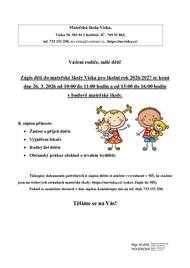 Zápis dětí do mateřské školy Víska pro školní rok 2026/2027 se koná dne 26. 3. 2026 od 10:00 do 11:00 hodin a od 15:00 do 16:00 hodin v budově mateřské školy.