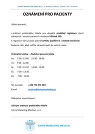 Od 5. 1. 2026 spouští ordinace praktického lékaře - Johny Marketing Medical, s.r.o. - každodenní registrace pro všechny stávající i nové pacienty. Provoz ordinace zůstává beze změny na známé adrese Višňová 190.