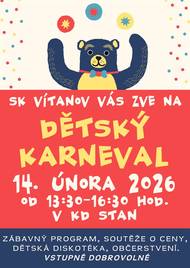 Vážení občané, SK Vítanov vás zve na DĚTSKÝ KARNEVAL 14. února od 13:30 do 16:30 v KD Stan. Je připraven zábavný program, soutěže o ceny, dětská diskotéka, občerstvení. Vstupné je dobrovolné.