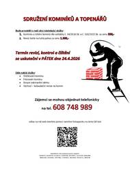 Sdružení kominíků a topenářů bude v obci provádět v pátek 24. 4. požadované kontroly a čištění komínů pro plyn i tuhá paliva dle zákona č. 34/2016 Sb. za následující ceny: - cena za kontrolu a čištění komínu 550,- Kč - cena za revizi kotle na tuhá paliva 1.300,- Kč Dále nabízí levné frézování a vložkování komínů a výchozí-kolaudační revize. Objednávky na 608 748 989