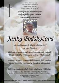 Smútiace rodiny Podskočová a Matúšová s hlbokým žiaľom oznamujú všetkým príbuzným a známym, že ich dňa 12.októbra 2025 navždy opustila JANKA PODSKOČOVÁ vo veku 56 rokov. Pohrebná sv. omša bude v sobotu 18.10.o 10:00 h. v kostole vo Vlčkovciach. Pohreb bude v sobotu dňa 18.10.o 11:30 h. v Lovčiciach
