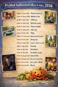 Přinášíme Vám předběžné termíny kulturních akcí v roce 2026. Upozorňujeme, že termíny se mohou v závislosti na zajištění programu, popř. kvůli nepřízni počasí ještě změnit.