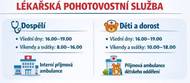 Dospělí • všední dny: 16.00–19.00 • víkendy a svátky: 8.00–16.00 Interní příjmová ambulance Děti a dorost • všední dny: 16.00–19.00 • víkendy a svátky 10.00-18.00 Příjmová ambulance dětského oddělení Pohotovost je určena pro akutní obtíže, které nesnesou odklad, ale neohrožují život.
