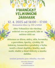 Obec Vohančice zve na Velikonoční jarmark, který se koná 12. dubna 2025 od 14:00 do 17:00 v komunitním domě. Na jarmarku budou k dostání dekorace, šperky, kosmetika a další zajímavé produkty, včetně dílniček pro návštěvníky.
