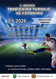 Zveme všechny příznivce sportu na 7. ročník tradičního novoročního turnaje ve fotbálku, který se uskuteční již tuto sobotu 3. 1. 2026 od 14:00 na umělce vedle fotbalového hřiště TJ Sokol Vojkovice. Přijďte si užít sportovní odpoledne, férové souboje a přátelskou atmosféru. Diváci vítáni – dobrá nálada zaručena!
