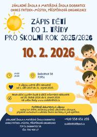 Základní škola a mateřská škola Dobratice zve rodiče a budoucí prvňáčky k zápisu do 1. třídy, který se uskuteční 10. 2. 2026. Rezervační systém bude spuštěn od 26. 1. 2026 do 6. 2. 2026. na webových stránkách školy 👉 Základní škola Dobratice Den otevřených dveří proběhne 6. 1. 2026. ℹ️ Více informací naleznete na webu školy www.zsdobratice.cz