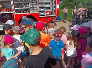 Děti z MŠ se seznámily s prací hasičů. Byla jim předvedena hasičská technika - hydraulické nůžky, termokamera. Mohly si nasadit ochrannou masku, helmu. Prohlédly si vybavení vozidel.