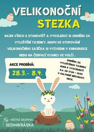 Před 28 dnyVelikonoční stezka pro všechnyPřijďte se zúčastnit Velikonoční stezky, kterou pořádá Místní spolek SEDMIKRÁSKA v naší obci. Vydejte se na cestu, najděte všech osm stanovišť a vyluštěním tajenky si odměňte svou snahu. Mapa potřebná k stopování velikonočního zajíčka je k vyzvednutí v knihobudce nebo na čerpací stanici ve Volči.